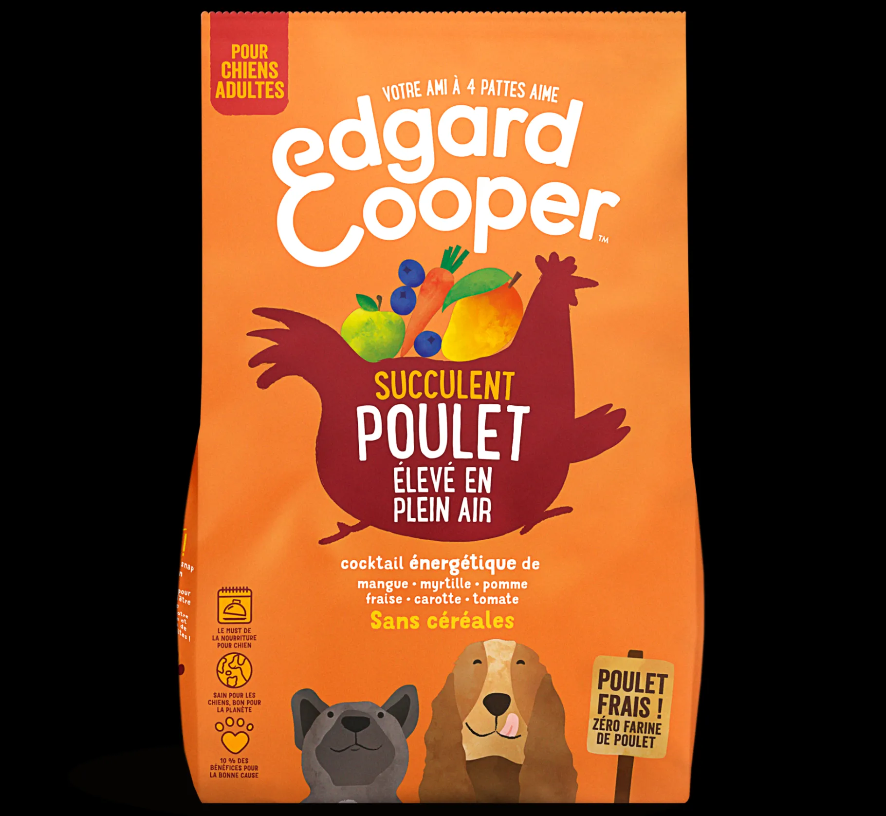verse kip 35%, bataten, erwten, verse zalm 5%, lijnzaad, erwteneiwit, kippensaus, mineralen, mannan-oligosachariden (MOS), fructo-oligosachariden (FOS), broccoli 0,04%, bosbessen 0,04%, vossenbessen 0,04%, cranberry’s 0,04%, boerenkool 0,04%, maca 0,04%, goudsbloemblaadjes, brandnetel, braambesblaadjes, venkel, karwijzaad, kamille, melisse, glucosamine, chondroïtinesulfaat.