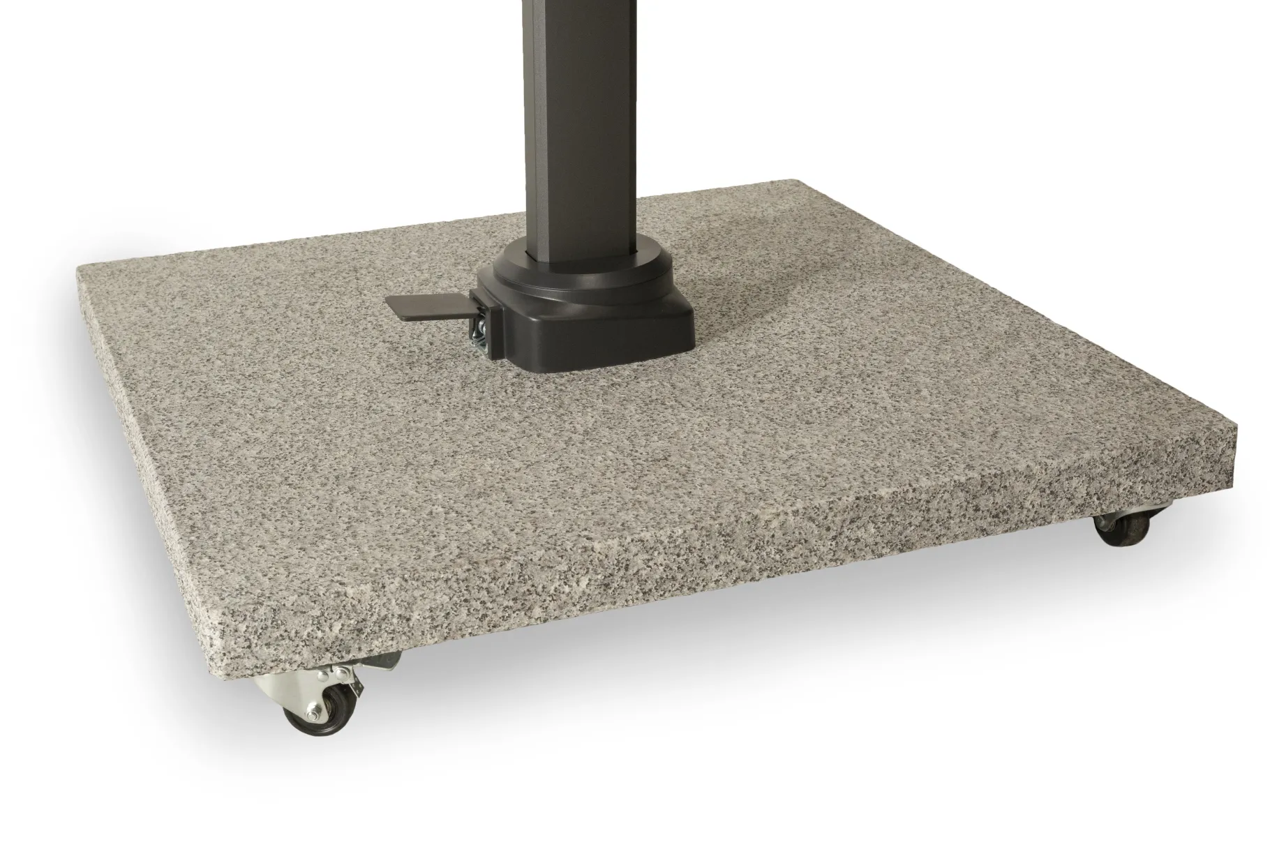 Een lichtgrijze parasolvoet van 120kg, met 4 wieltjes, voor onze Deluxe parasols. Het natuurlijk materiaal zorgt ervoor dat de voet bestand is tegen verschillende weersomstandigheden en het hele jaar buiten kan blijven staan. De voet is voorzien van vier wielen om de parasol makkelijk te verplaatsen.