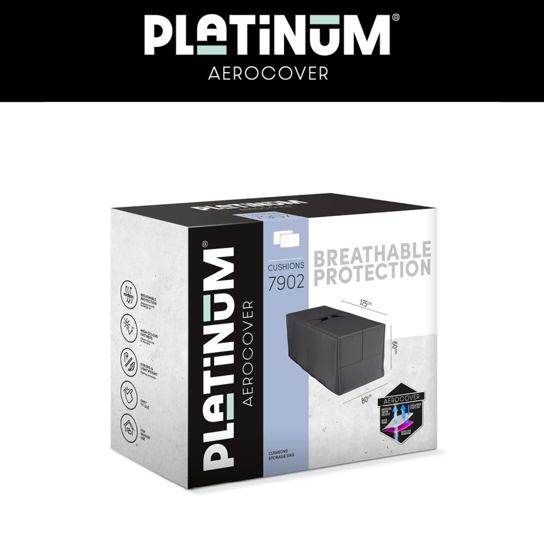 Ademende Platinum AeroCover kussentas 170x80xh60cm voor het opbergen van loungesetkussens. De kussentas heeft versterkte handvaten en een dubbele rits zodat u makkelijk bij de kussens kunt. Platinum AeroCover kussentassen zijn voor binnengebruik. De stof heeft een hoge kleurechtheid dankzij de door en door geverfde vezels.