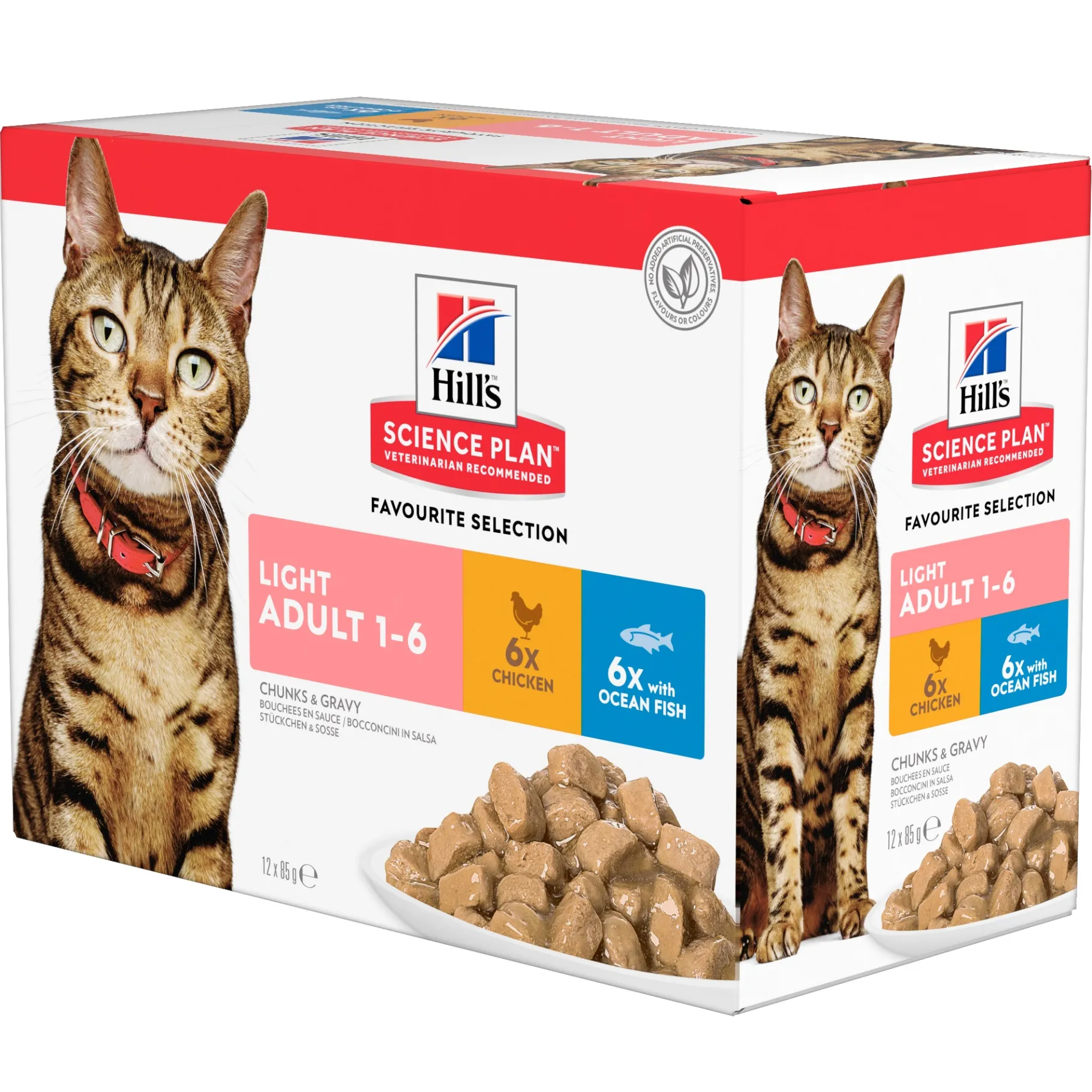 HILL’S SCIENCE PLAN Light Adult Kattenvoer met Kip – maaltijdzakje, ANALYTISCHE BESTANDDELEN: Eiwit 7,8%, Vetgehalte 1,9%, Ruwe celstof 2,0%, Ruwe as 1,3%, Vocht 79,0%, Calcium 0,19%, Fosfor 0,13%, Natrium 0,08%, Kalium 0,14%, Magnesium 0,01%; per kg: Vitamine A 28.397IE, Vitamine D3 154IE, Vitamine E 105mg, Vitamine C 21mg, Bèta-caroteen 0,25mg., HILL’S SCIENCE PLAN Light Adult Kattenvoer met Zeevis – maaltijdzakje, ANALYTISCHE BESTANDDELEN: Eiwit 7,1%, Vetgehalte 1,8%, Ruwe celstof 2,0%, Ruwe as 1,3%, Vocht 81,0%, Calcium 0,19%, Fosfor 0,15%, Natrium 0,08%, Kalium 0,16%, Magnesium 0,01%; per kg: Vitamine A 21.725IE, Vitamine D3 206IE, Vitamine E 95mg, Vitamine C 19mg, Bèta-caroteen 0,23mg.