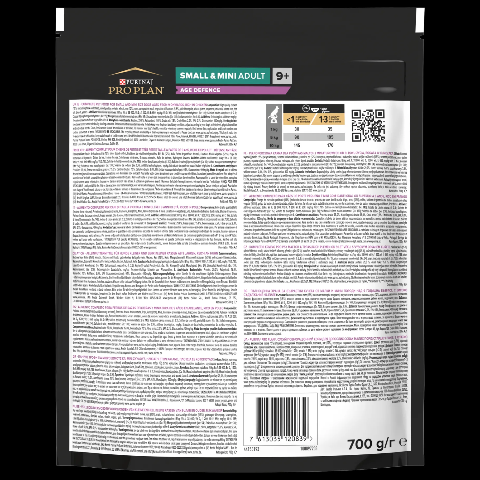 Poulet de haute qualité (15%) (dont dos et coffre), Protéines de volaille déshydratées, Blé, Riz (12%), Maïs, Farine de protéines de maïs, Fractions d’huile végétale (5,5%), Pulpe de betterave déshydratée, Gluten de blé, Farine de soja, Substances minérales, Graisses animales, Huile de poisson, Hydrolysat, Levures.