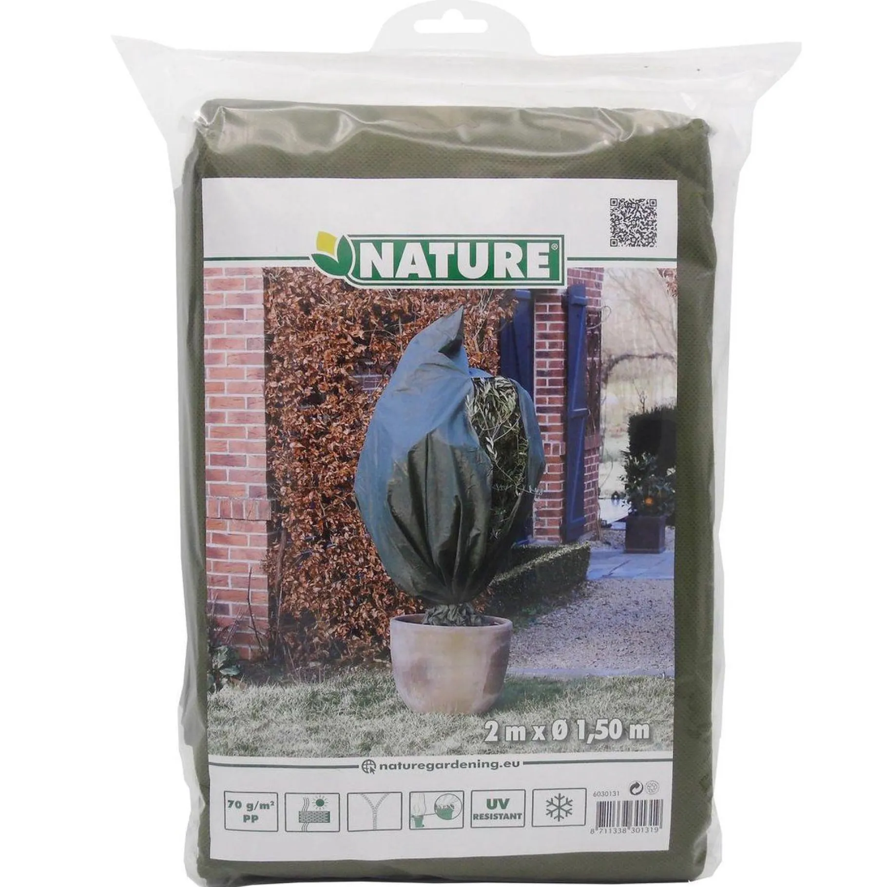 Afdekhoes van vliesdoek van Nature gemaakt van groen, uv-bestendig, niet-geweven polypropyleen. De hoes is voorzien van een ritssluiting en een koord aan de onderzijde voor een snelle bevestiging en, indien strakgetrokken, voor een betere isolatie. De ritssluiting maakt het mogelijk de plant snel te verzorgen, te luchten of water te geven. Geschikt voor het beschermen van (mediterrane) planten en struiken tegen lage temperaturen (lichte vorst). Het vliesdoek laat goed water en lucht door, wat betekent dat de plant kan ademen. Dit voorkomt verstikking van de plant.